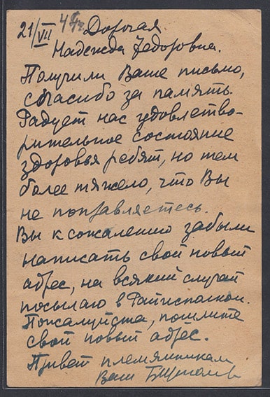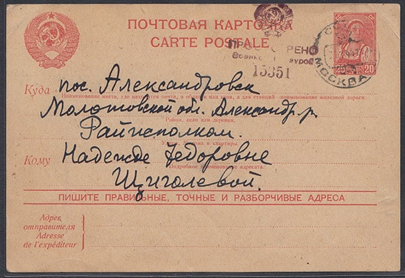 Почтовая карточка. Марка - Колхозница с серпом. 1939 г. Цензура 15351 1941 год