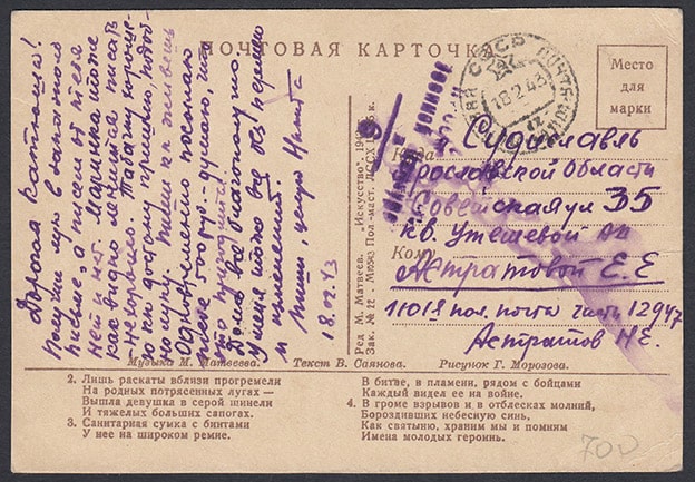Почтовая карточка. Песня о дружиннице, 1943 год, досмотрено военной цензурой