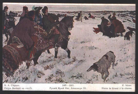 Почтовая карточка. Петр Великий на охоте. Художник В. Серов. 1910 год.
