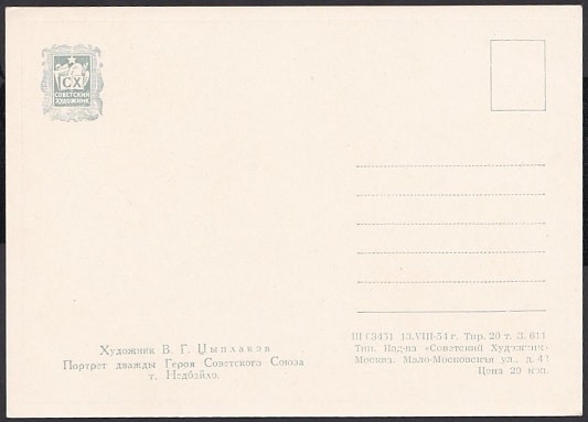 Почтовая карточка Портрет дважды Героя Советского Союза т. Недбайло худ. В.Г. Цыплаков, 1954 год