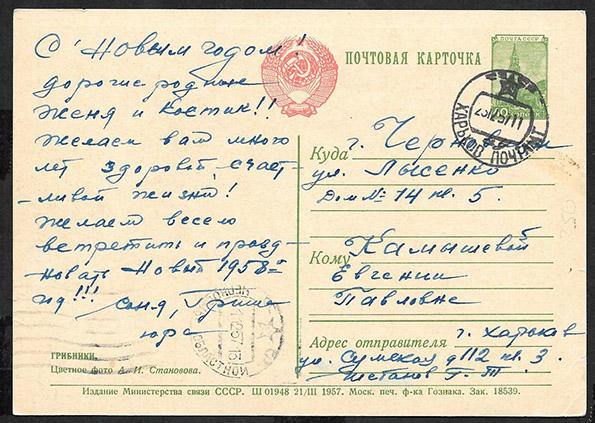 Почтовая карточка. Прошла почту. Грибники, 21.03.1957 год