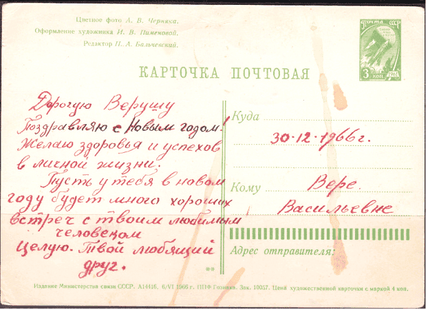 Почтовая карточка С Новым Годом! 06.06.1966 год. Подписанная