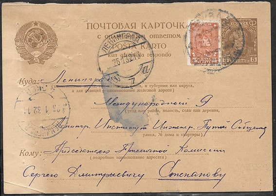 Почтовая карточка с оплаченным ответом № 1.1.52 I, прошла почту 1932 год