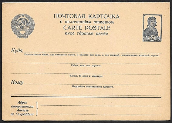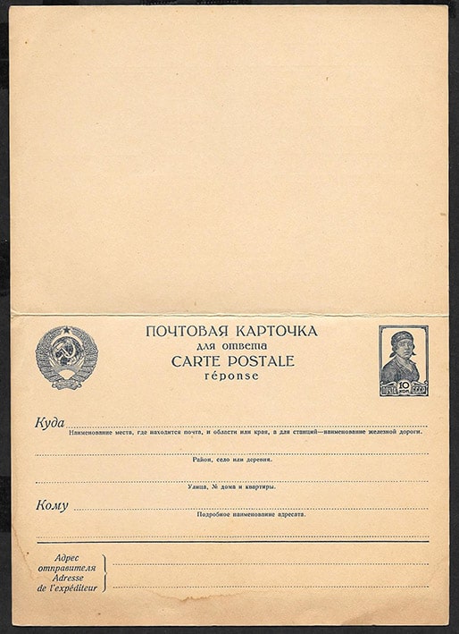 Почтовая карточка с оплаченным ответом. Стандарт 10 копеек, 1940 год. № 1.1.140