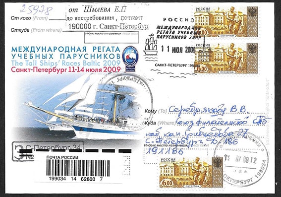 Почтовая карточка со спецгашением. Международная регата учебных парусников, СПб 11-14 июля 2019 г. Прошла почту