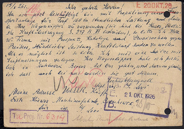 Почтовая карточка. СССР - Германия. Прошла почту 15.10.26 г. из Киева