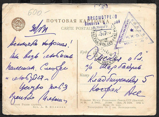 Почтовая карточка. Степан Разин, 1941 год. Красноармейское, просмотрено цензурой, 1942 год