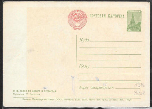Почтовая карточка В.И. Ленин по дороге в Петроград. 13.09.57 г. № 319 (Кат. В. и А. Ивашкины)