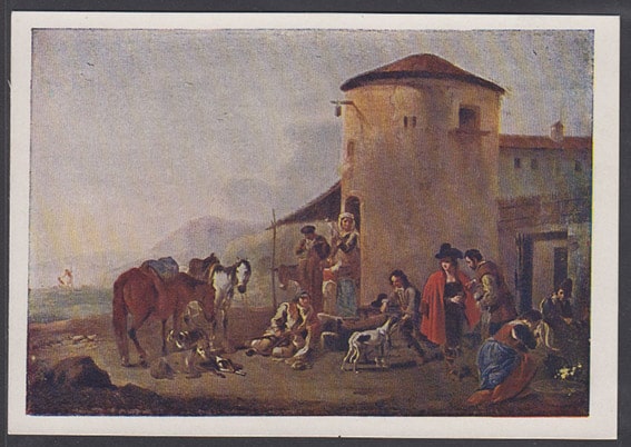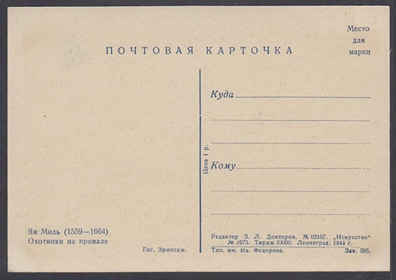 Почтовая карточка. Ян Миль. Охотники на привале, 1945 год