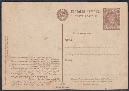 Почтовая маркированная карточка, 1929 год. Крепостная актриса в опале, худ. Касаткин