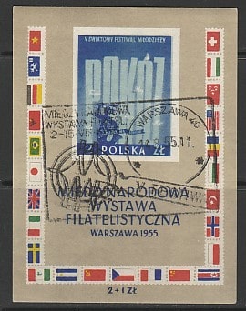 Польша 1955 год. Международный фестиваль молодёжи и студентов в Варшаве (I0, блок (спецгашение)