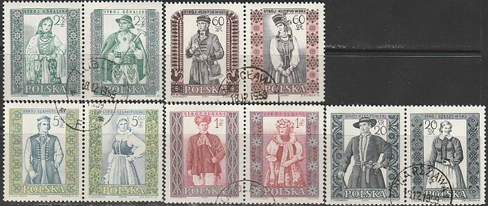 Польша 1959 год. Национальные костюмы, 5 пар гашёных марок