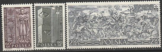 Польша 1960 год. 550 лет битве при Грюнвальде. Могильная плита царя Владислава, часть памятника, картина битвы Яна Матейна. 3 марки