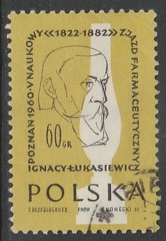 Польша 1960 год. Игнатий Лукасевич, польский фармацевт, 1 марка (гашёная)