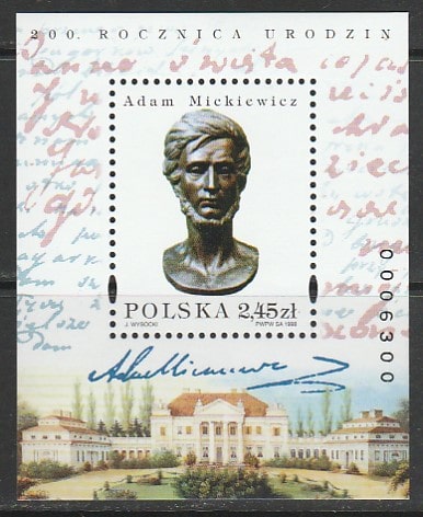 Польша 1998 год. Бюст поэта и писателя Адама Мицкевича, блок.