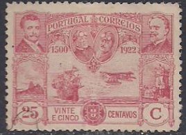 Португалия 1922 год. Годовщина первого перелета Лиссабон - Бразилия (ном. 25). 1 марка из серии (наклейка) 0.4м