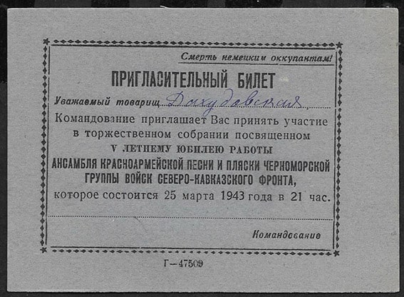 Главная › Каталог › ДОКУМЕНТЫ › 1941-1945 гг. › Пригласительный билет на ансамбль красноармейской песни и пляски черноморской группы войск северо-кавказского фронта, 1943 год