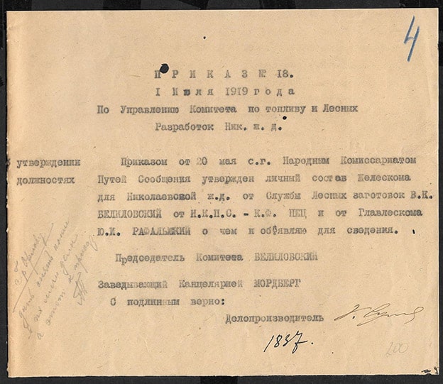 Приказ № 18, 1 июля 1919 года, об утверждении в должностях. Упр. Ком. по топлив и Лесных разработок