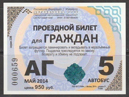 Проездной билет для граждан. Автобус. Мурманск, май 2014 год.