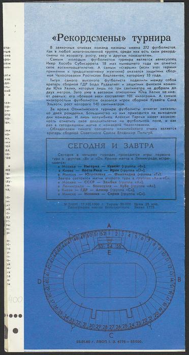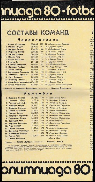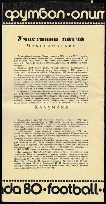 Программа Олимпийского группового турнира по футболу. Ст. им. Кирова. Чехословакия - Колумбия. 21 июля 1980 г.