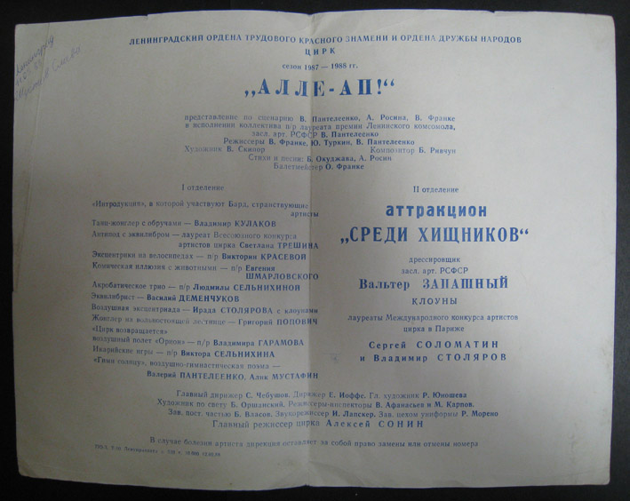 Программа сезона 1987 - 1988 гг. "Алле-Ап". Ленинградский Цирк