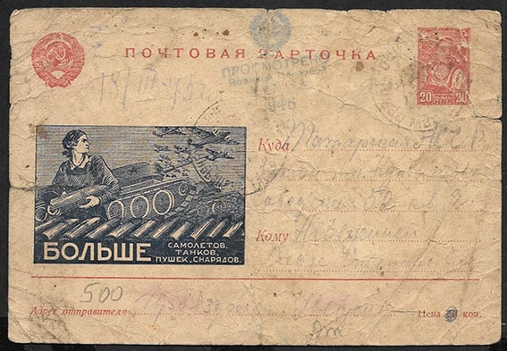 Рекламно-агитационная почтовая карточка № 7-13, 1942 год. Больше самолетов, танков, ппушек, снарядов. Прошла почту