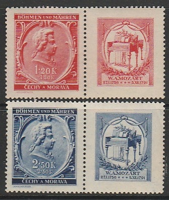 Рейх 1941 год. Богемия и Моравия. В.А. Моцарт, 2 марки с купонами из серии.