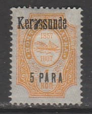 Россия 1909-1910 год. "Русский Левант". РОПиТ. НДП. Керасунд, 5 ра/1 к, Разновидность - брак печати в НДП,1 марка из серии (наклейка)