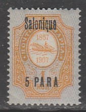 Россия 1909-1910 год. "Русский Левант". РОПиТ. НДП. Салоники, 5 ра/1 к, 1 марка из серии (наклейка)