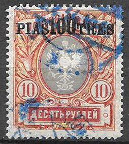 Россия 1912 г. Почтовая марка 10 рублей с надпечаткой 100 пиастров. Русский Левант
