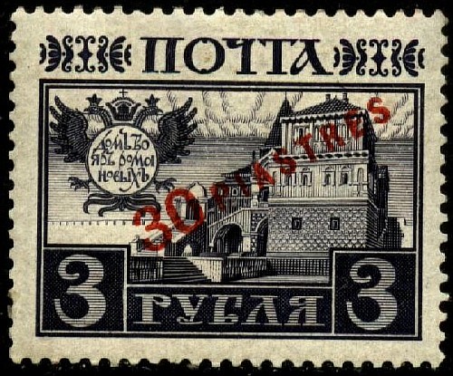 Россия 1913 год. Русский Левант. Почтовая марка 3 рубля. с надпечаткой "30 пиастров"