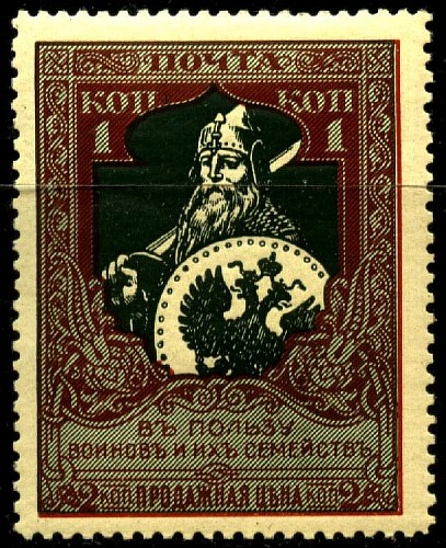 Россия 1914 год. Почтовая марка в пользу воинов и их семейств, 1 копейка, перфорация лин. 12 1/2