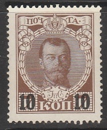 Россия 1916 год. XXIV (вспомогательный) выпуск общегосударственных марок. Николай II. НДП нового номинала 10 к./7 к., 1 марка