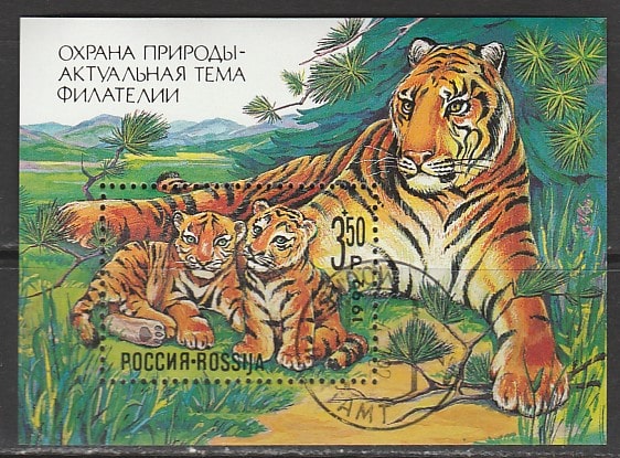 Россия 1992 год. Амурская тигрица с тигрятами на фоне пейзажа Приморья, блок (гашёный) (4 Бл.1)