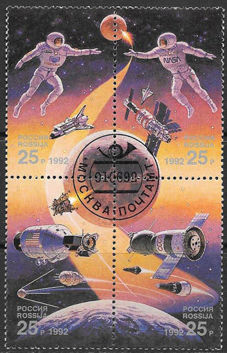 Россия 1992 год. Освоение космического пространства. Международный год космоса, гашеный квартблок. Совместный выпуск: Россия-США.