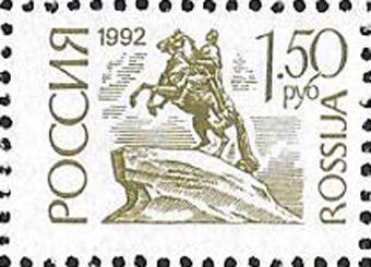 Россия 1992 год. Стандарт. 1 руб. 50 коп., 1 марка. Простая бумага. Перфорация гребенка 12 1/4 : 11 3/4