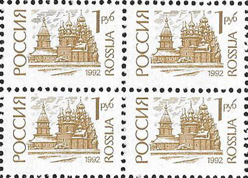 Россия 1992 год. Стандарт. 1 рубль, квартблок. Простая бумага. Перфорация гребенка 12 1/4 : 11 3/4