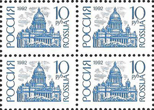 Россия 1992 год. Стандарт. 10 рублей, квартблок. Простая бумага. Перфорация гребенка 12 1/4 : 11 3/4