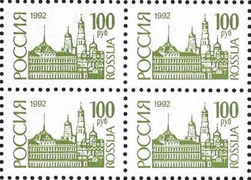 Россия 1992 год. Стандарт. 100 рублей, квартблок. Простая бумага. Перфорация гребенка 12 1/4 : 11 3/4