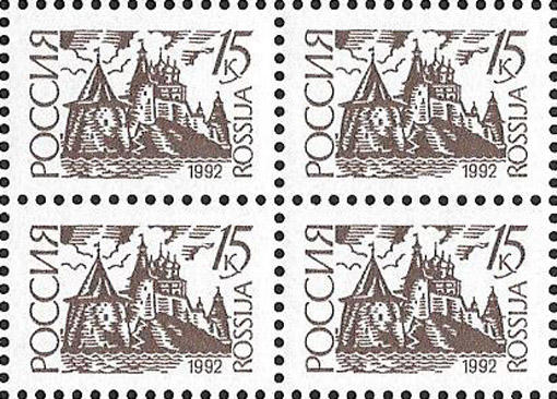 Россия 1992 год. Стандарт. 15 копеек, квартблок. Простая бумага. Перфорация гребенка 11 1/2 : 12