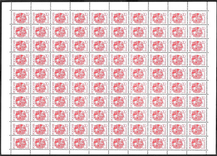 Россия 1992 год. Стандарт. 20 копеек, лист. Мелованная бумага. Перфорация гребенка 12 1/4 : 11 3/4