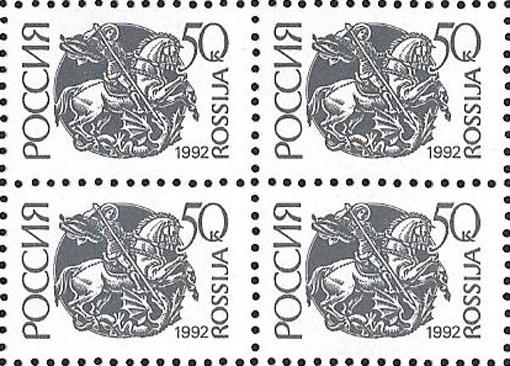 Россия 1992 год. Стандарт. 50 копеек, квартблок. Простая бумага. Перфорация гребенка 12 1/4 : 11 3/4