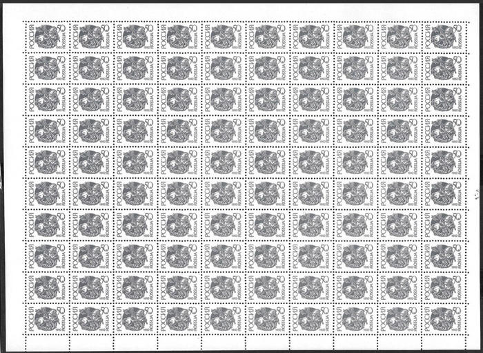 Россия 1992 год. Стандарт. 50 копеек, лист. Простая бумага. Перфорация гребенка 12 1/4 : 11 3/4