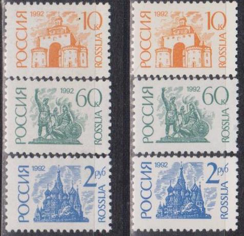 Россия, 1992 год, Стандарт ном.: 10 коп.; 60 к; 2 руб., мелованная и простая бумага, 6 марок