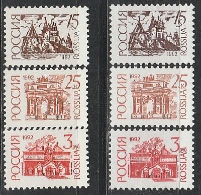 Россия 1992 год, Стандарт ном.: 15 коп.; 25 коп. и 3 р., мелов. и простая бумага, 6 марок