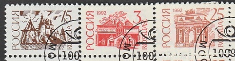 Россия 1992 год. Стандартный выпуск. Псковский Кремль. Триумфальная арка. Третьяковская галерея, 3 марки (гашёные) (26-28)Мелованная бумага.