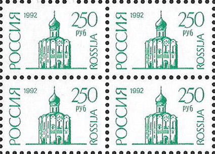 Россия 1993 год. Стандарт. 250 руб., квартблок. Простая бумага. Перфорация гребенка 11 1/2 : 12