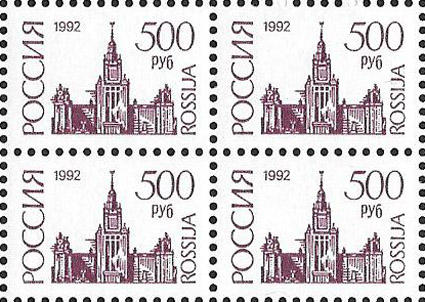 Россия 1993 год. Стандарт. 500 руб., квартблок. Простая бумага. Перфорация гребенка 11 1/2 : 12