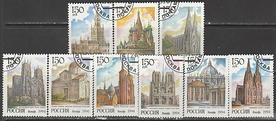 Россия 1994 год. Соборы мира, 9 марок (гашёные) (149-157)