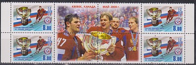 Россия 2008 год, Российские Хоккеисты. Чемпион Мира, 4 марки + 4 купона. сцепка (2 м.+к+2 м.)